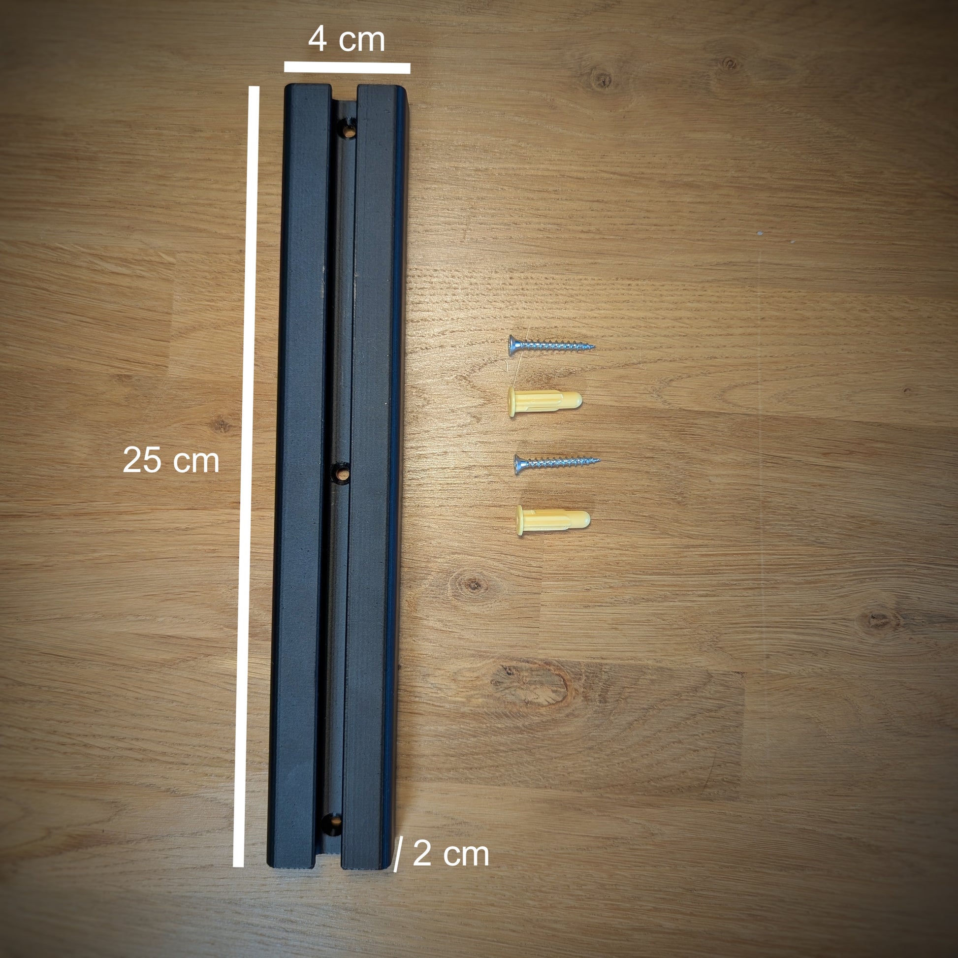 This 25 cm fixing bar allows you to easily install a wide range of accessories for your workshop, sim racing setup, bike gear and much more. It mounts directly onto a wall or a wooden board using the included screws and wall plugs.