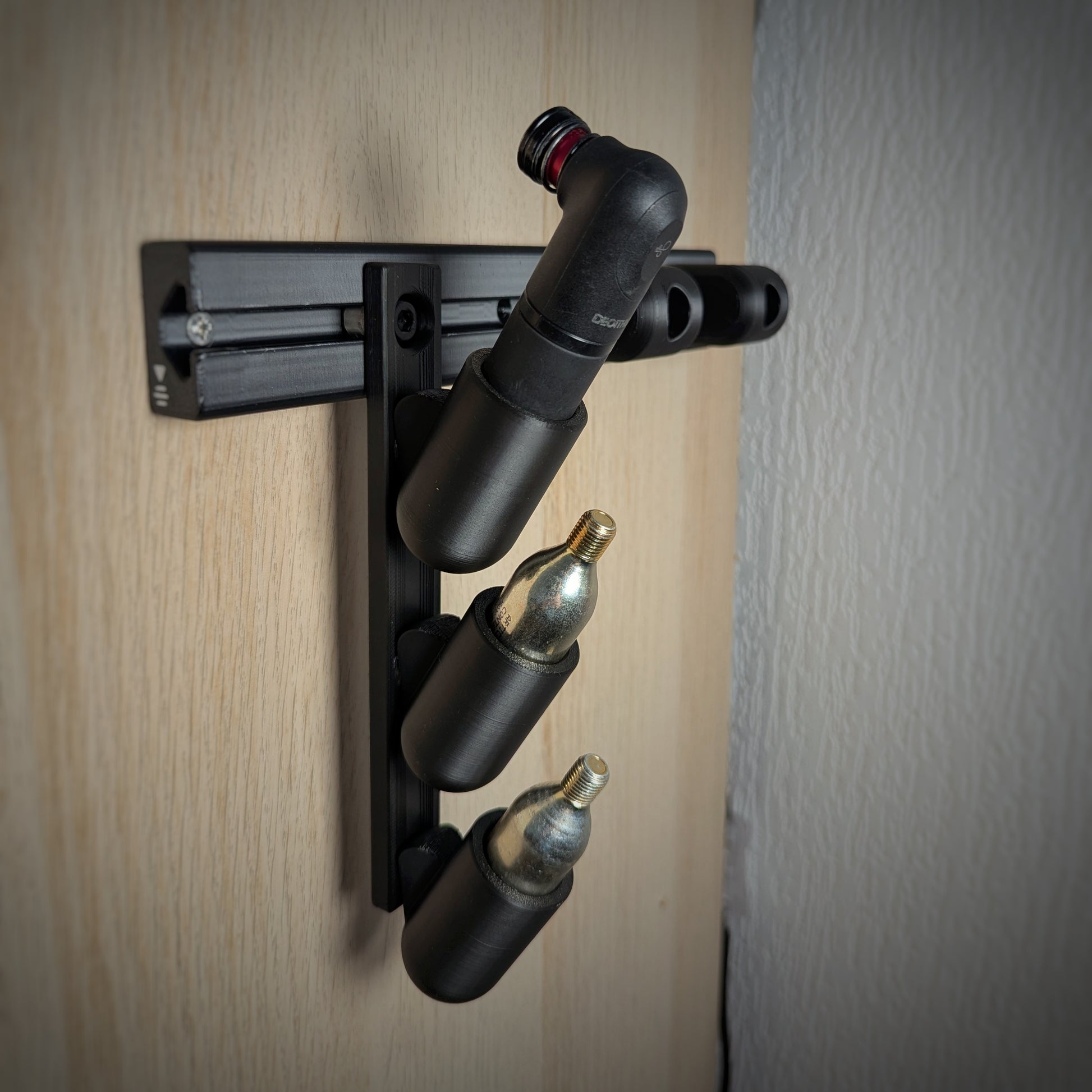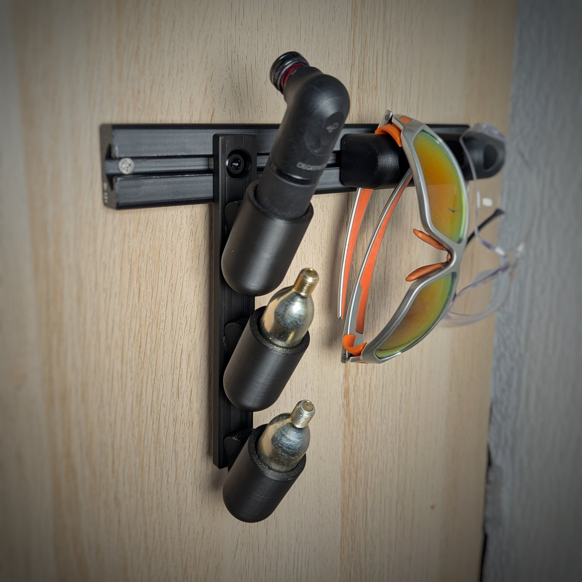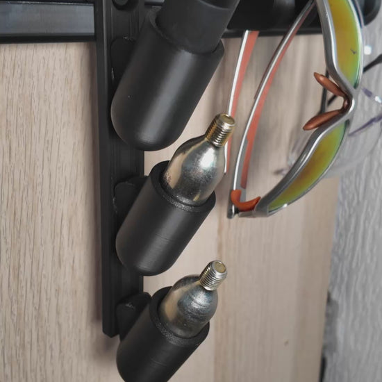 Zaprojektowany do montażu na listwie modułowej XavLab, stabilnie utrzymuje pompkę CO₂ oraz dwa naboje – bez luzem leżących narzędzi.