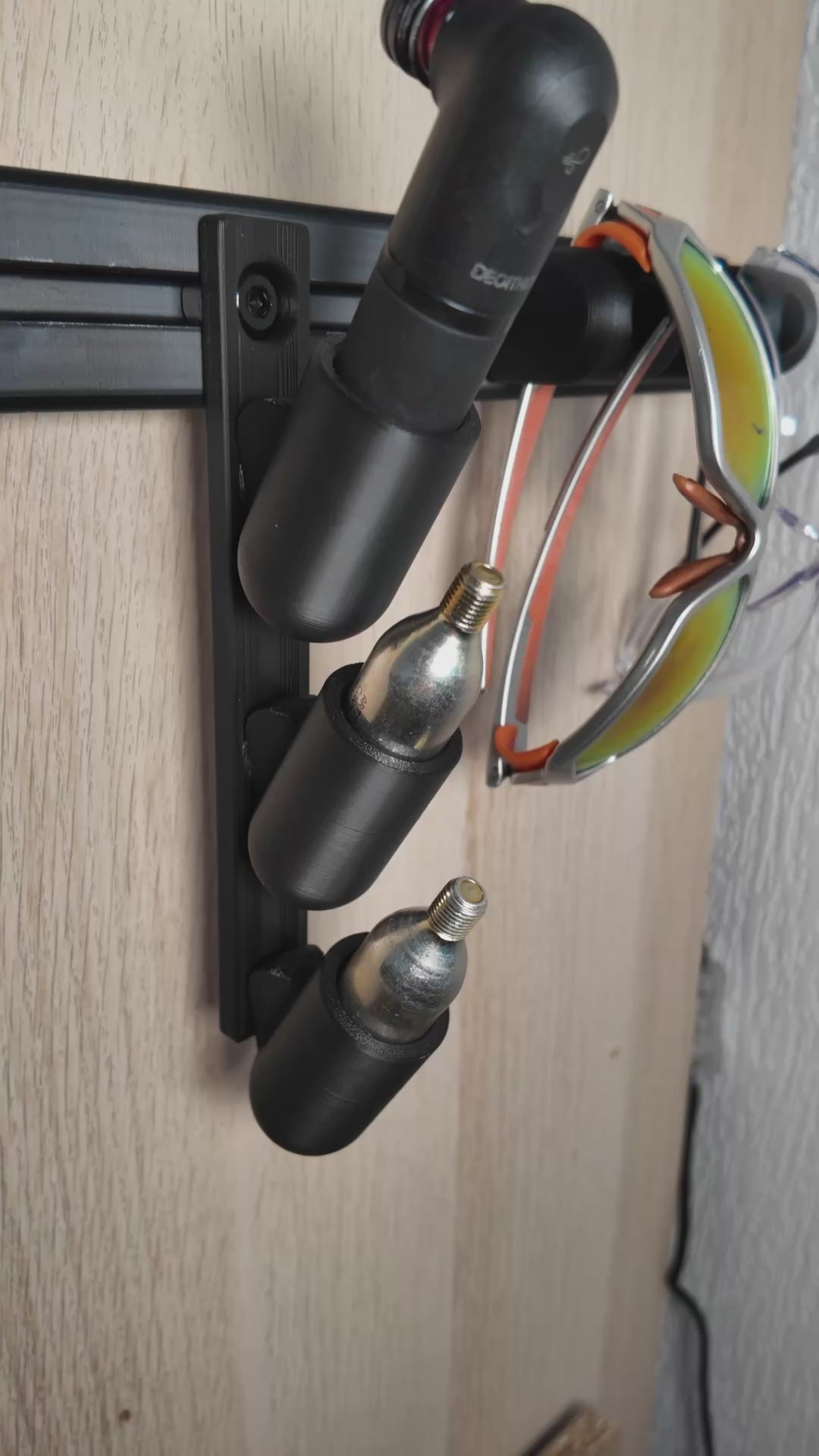 - Pionowe przechowywanie: 1 miejsce na pompkę + 2 na naboje CO₂